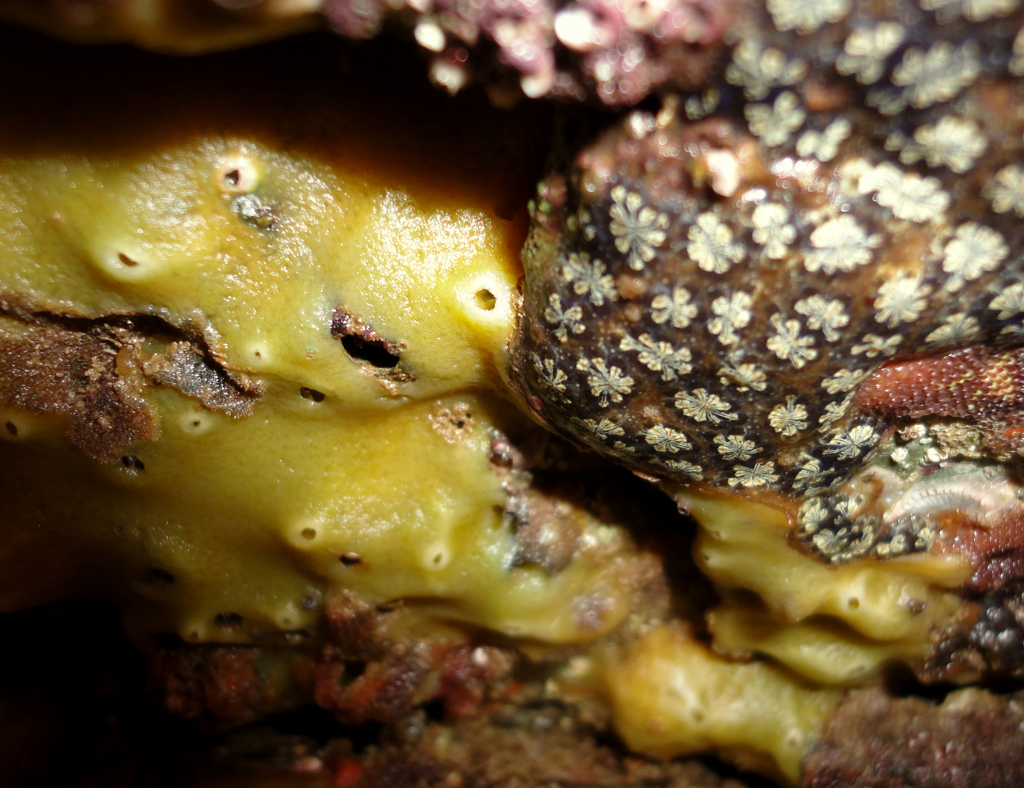 Pink encrusting seaweeds cover the exposed rocks and in the shadows crocus-yellow breadcrumb sponges, red bryozoans and the twinkling white flower shapes of the star-ascidian sea squirt form an animal mosaic.