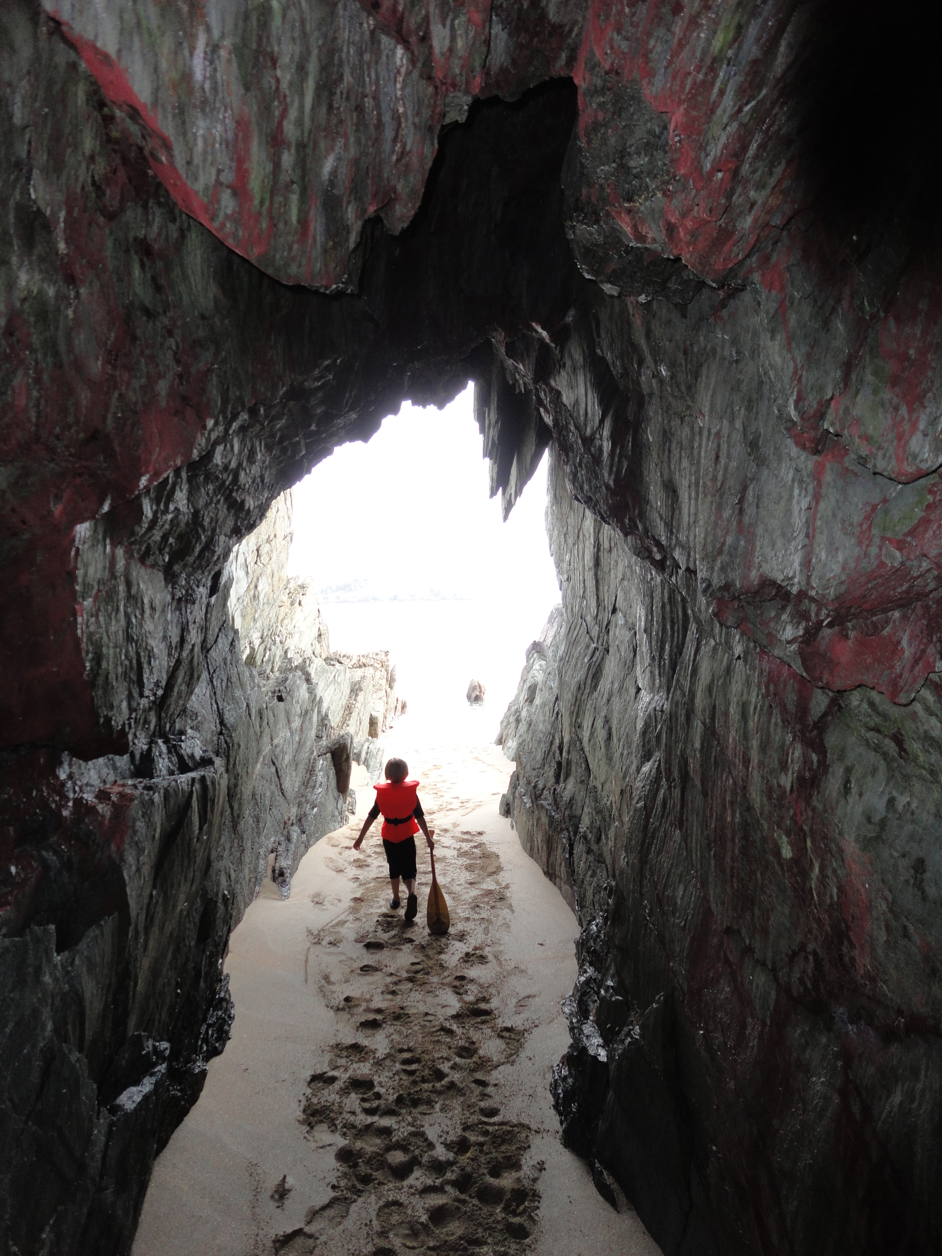 We spy a distant patch of sand framed by high cliffs and scattered rocks, inaccessible by foot or large boat. My five-and-three-quarter year old takes over command of the vessel, paddling furiously then calling orders until we line up and let the small waves carry us onto the shore.