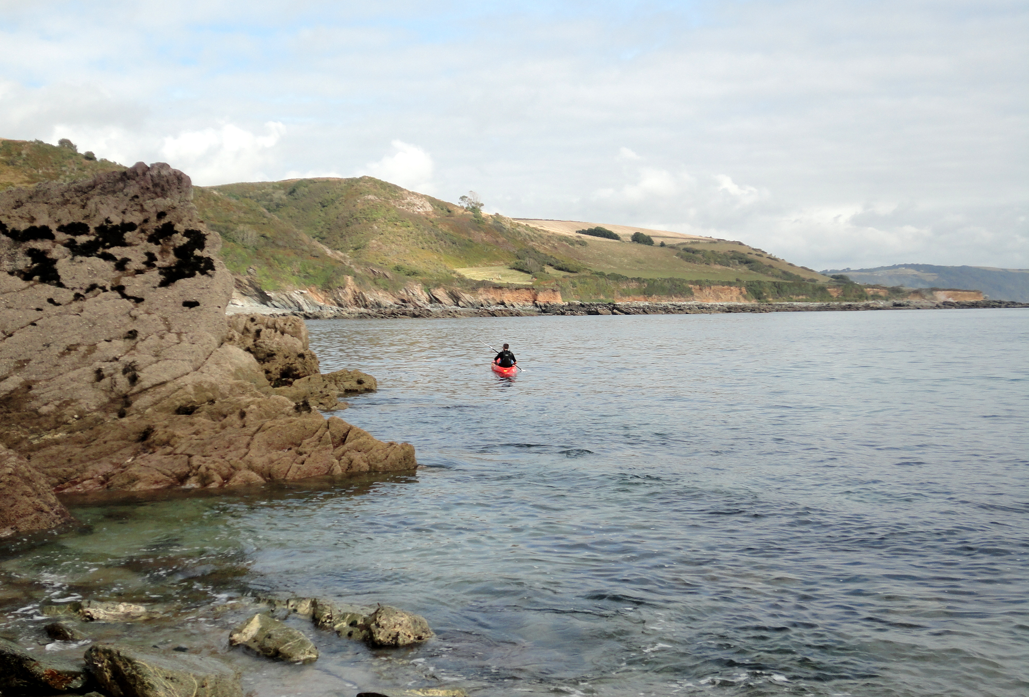 We paddle through the channel between Looe Island nature reserve and the mainland, watching for rocks and enemy ships. A lone grey heron, fishing in the newly exposed pools, twists his head to watch us. A fishing boat motors past in the distance, heading for harbour before the tide falls.