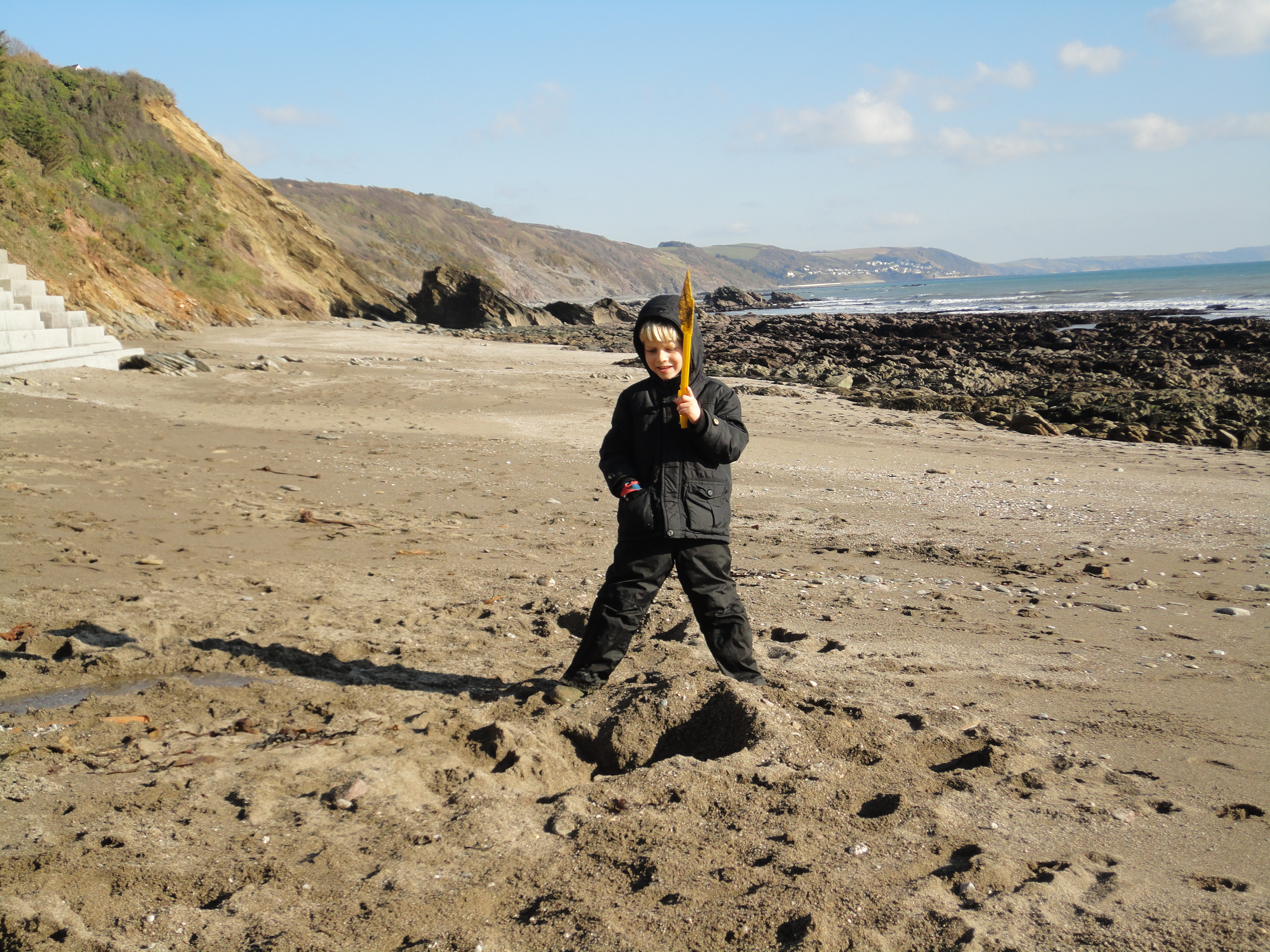 A dog walker steps out across the beach glancing at my son. She hasn’t spotted me here among the high rocks, she just sees a lone child digging out a pit, but he’s grinning and chattering, inviting her to join him so she leaves him to it.