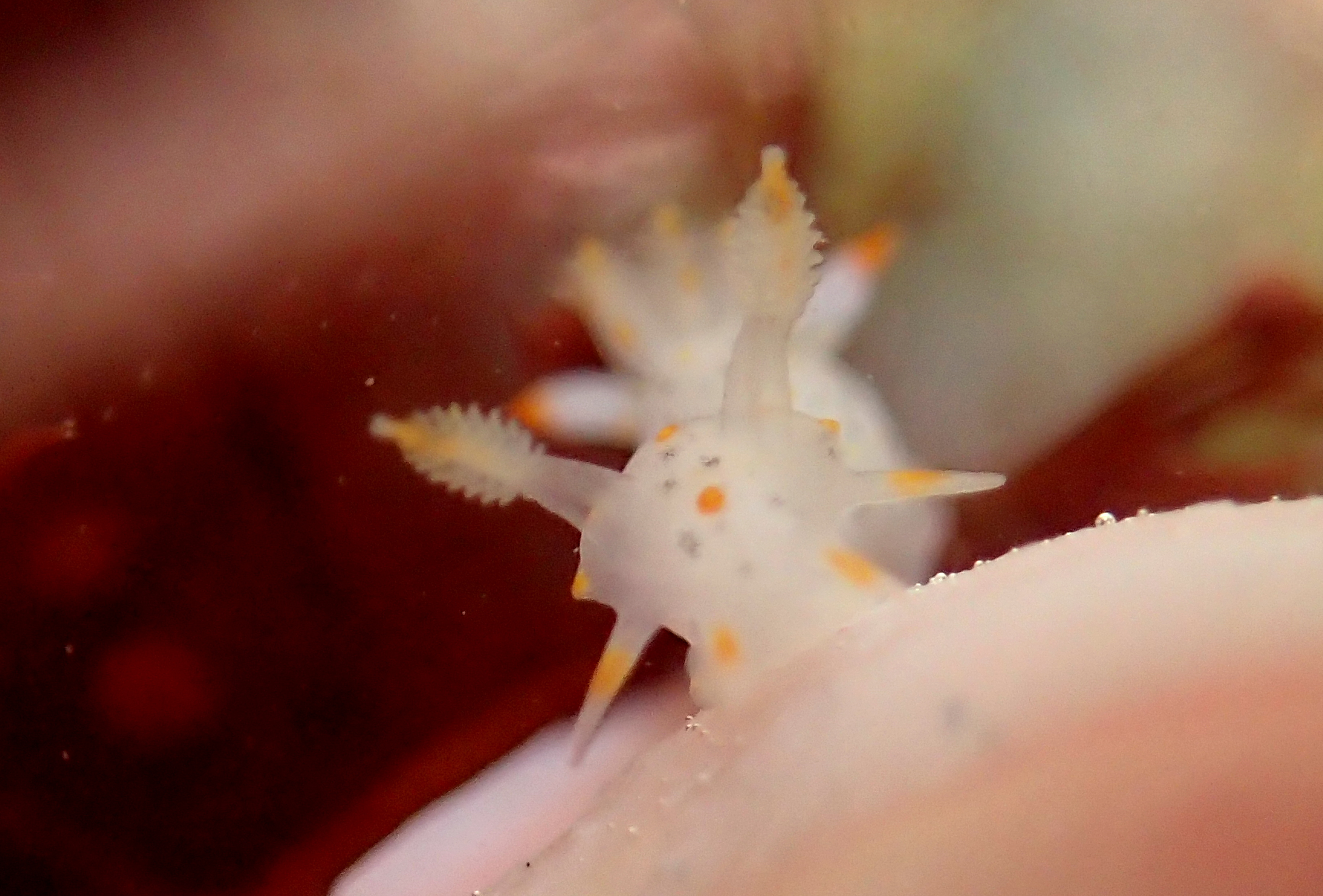 As I look for more jellies, a white blob just a few millimetres long catches my eye. It’s a tiny sea slug, a baby Polycera quadrilineata. It has a wonderfully feathered pair of rhinophores on top of its head and various yellow appendages around its mouth and bushy gills.