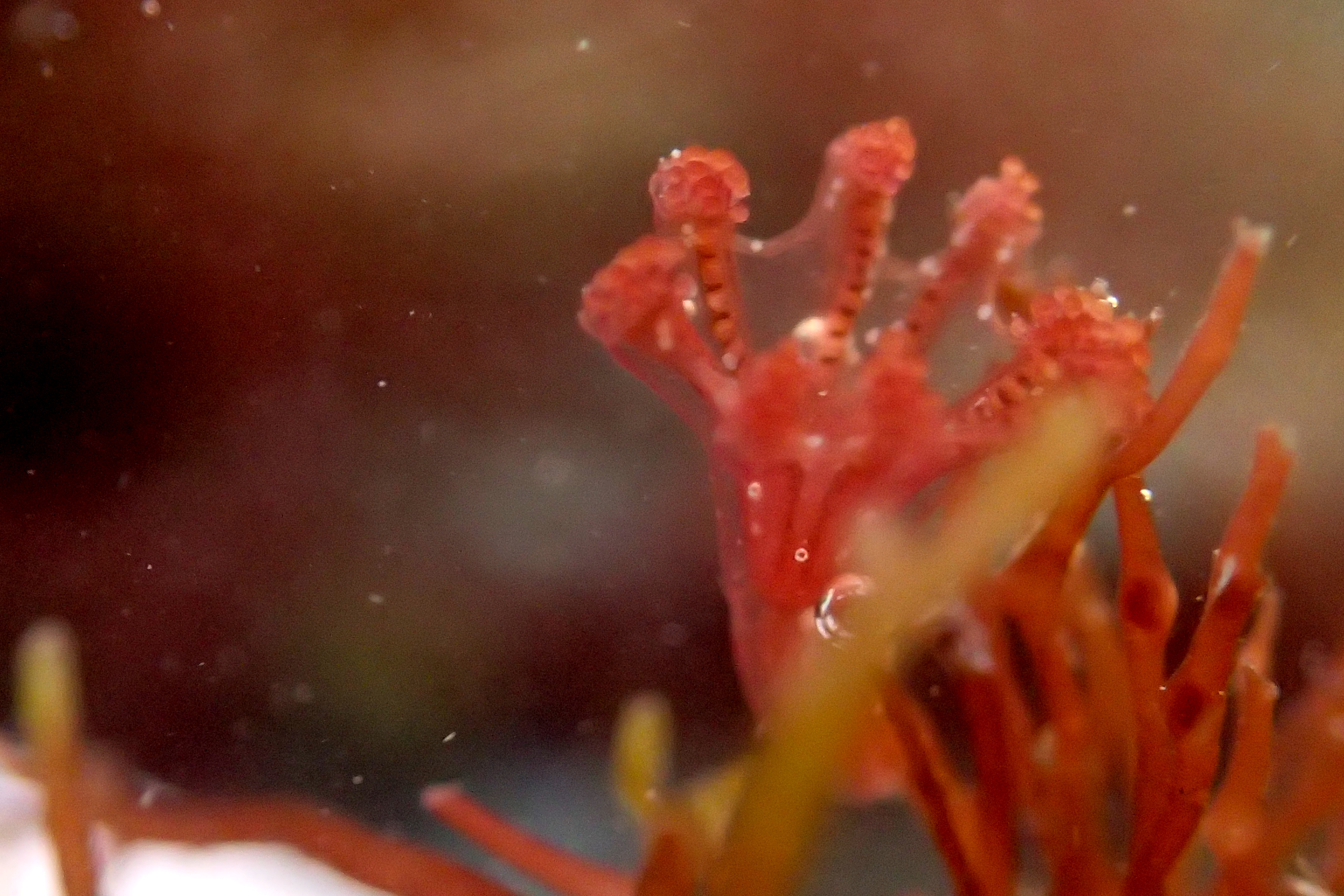 It’s always a good idea to move slowly in the rockpools and today I have nothing to rush for. By staring at the seaweed for a very long time, I begin to notice more details and my eye is drawn to a stalked jellyfish. The blobs between the arms are primary tentacles, suckers that the jelly can use to move around.