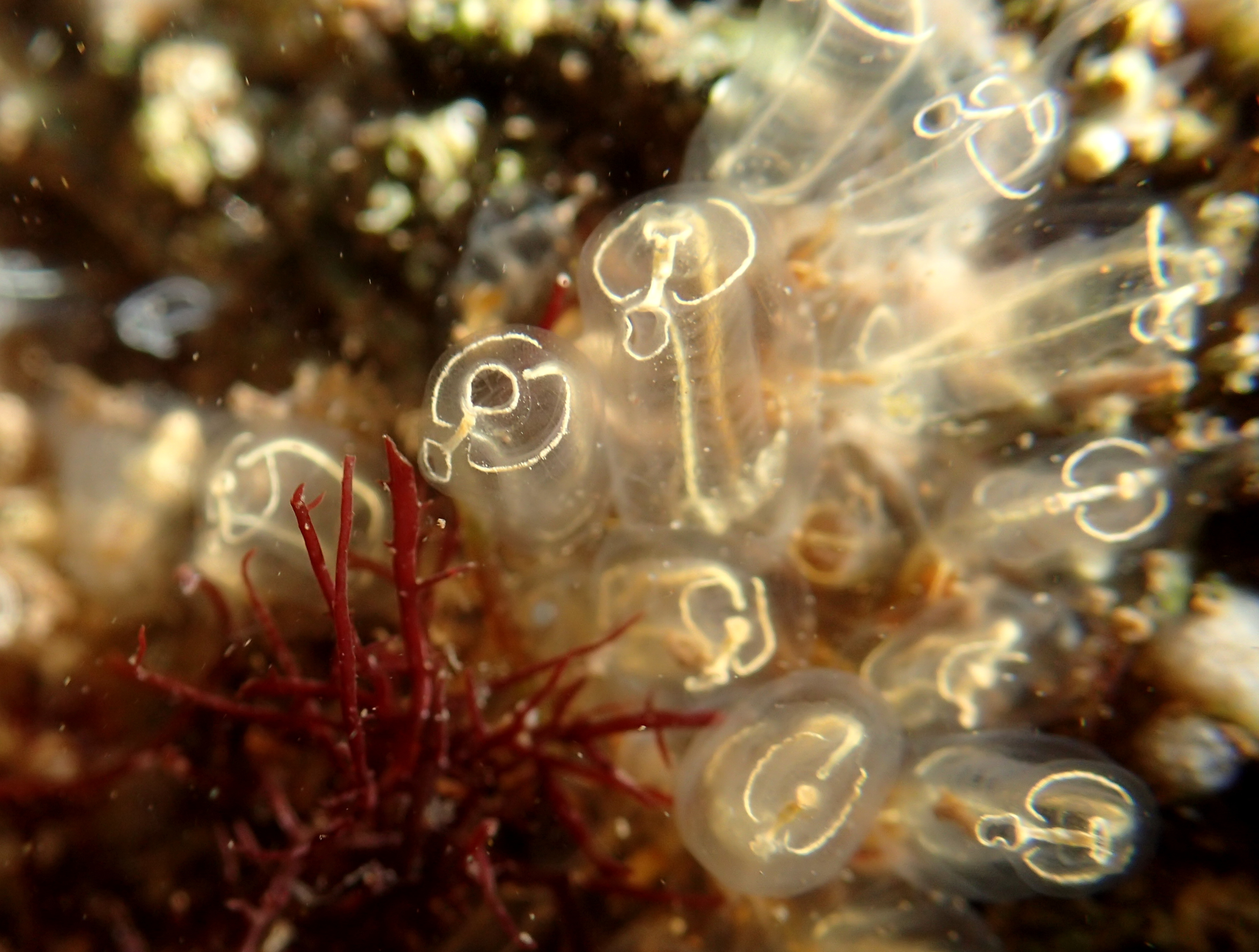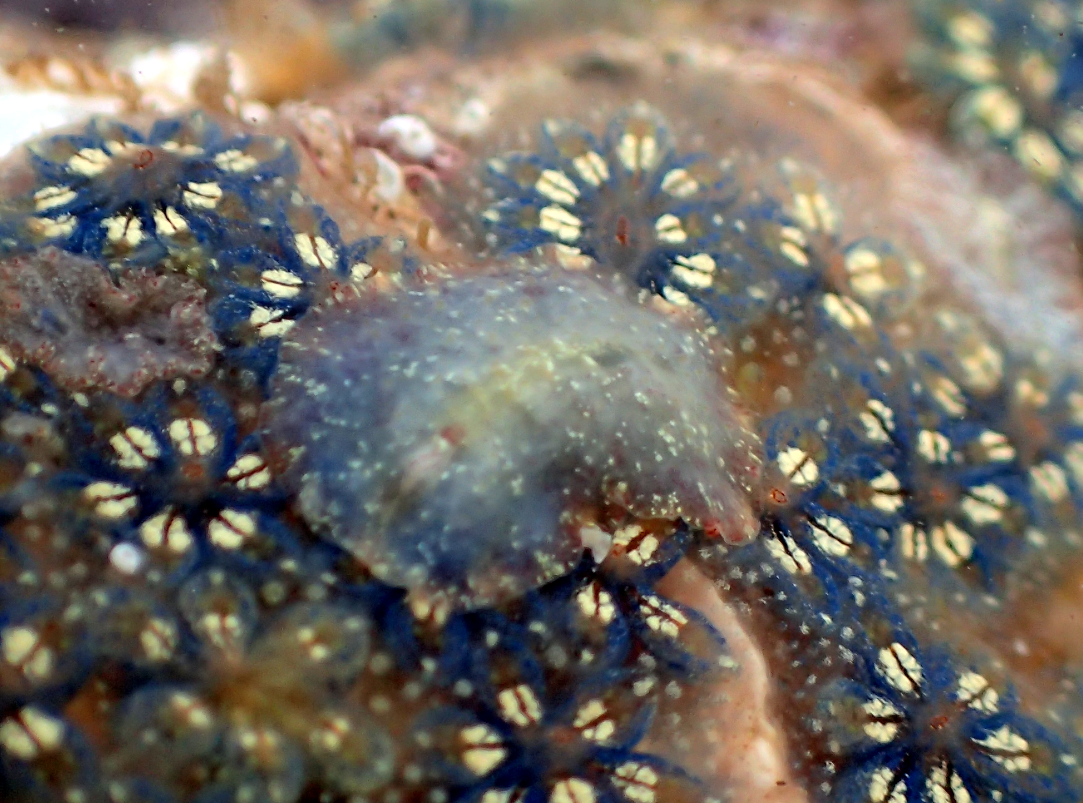 As I look more closely I see flatworms moving across the sea squirts. They seem to be iridescent, flecked with glowing yellow spots. They have head tentacles, like a slug, with eye spots at the end. They’re fascinating creatures but very hard to identify to species level in the field.