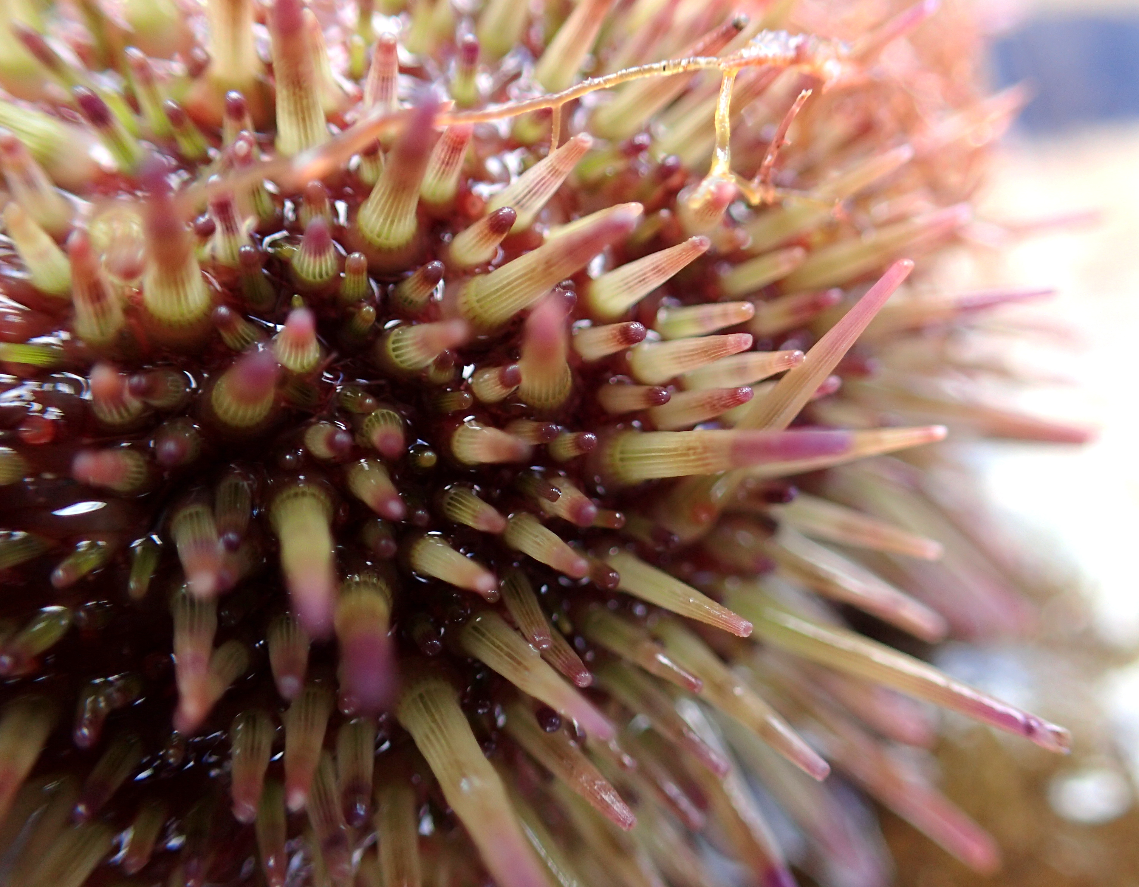 In one area there are many shore urchins. They often seem to cluster together like this. I notice one has its tentacle feet out, reaching in all directions.