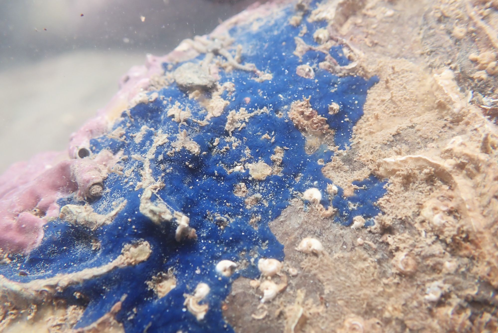 In the absence of blue skies, this gorgeous patch of blue sponge (Terpios gelatinosa) will do nicely. The deep velvety colour is soft and comforting.