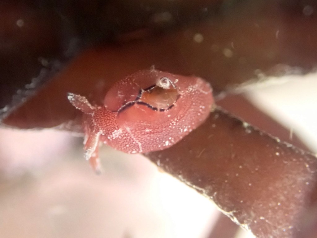 With the tide rising up my boots I was about to give up on the stalked jellies, when I saw a tiny shape float past me. It looked like a stalked jellyfish that had become detached from the seaweed, drifing with the tide. I made a quick grab and scooped it into a bucket.