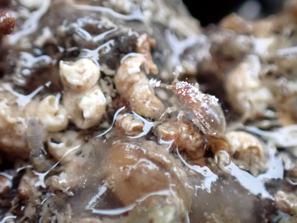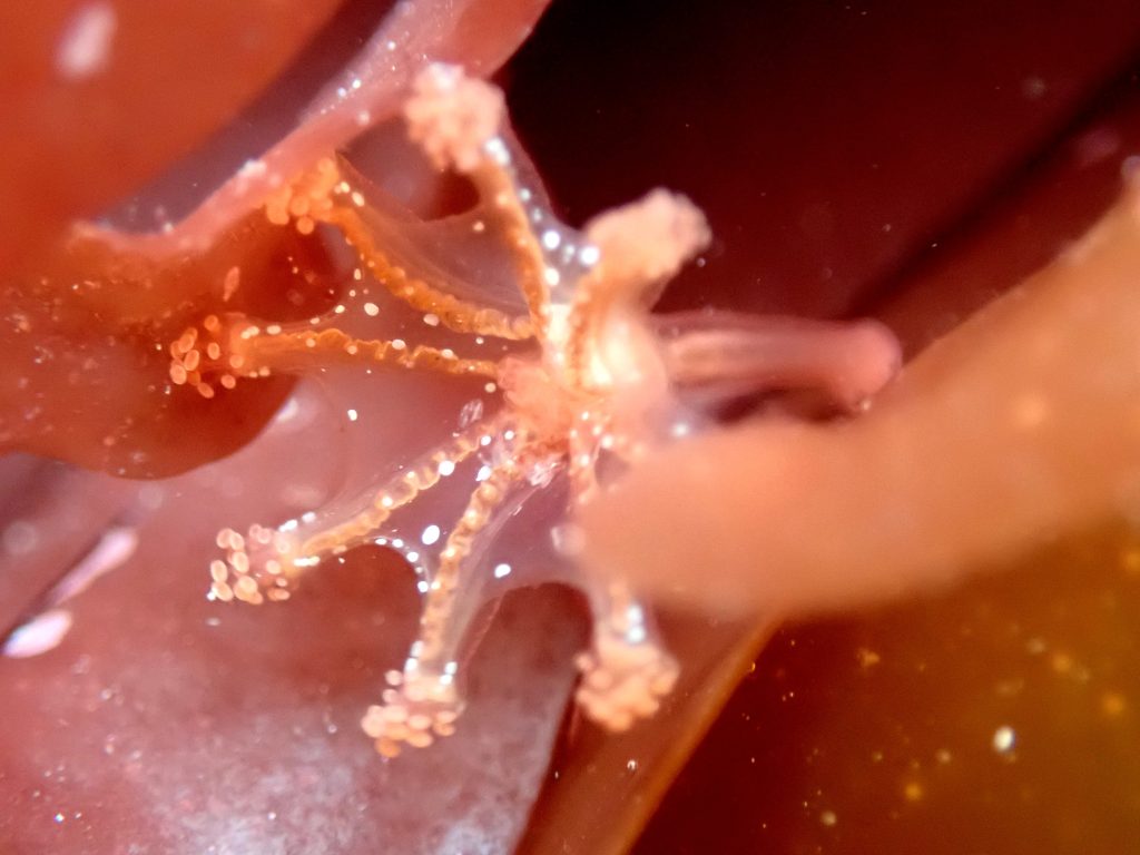 Under my camera it was weirder than ever. The rocket shape was enclosed in a jelly dome and the tentacles had a knobbly appearance, rather like the sucker arms of an octopus. At the base of each tentacle was a black spot: a primitive eye. This was a jellyfish-like medusa of an athecate hydroid, Cladonema radiatum, a species I’ve only seen once before. We decided to call it the rocket jelly, although I’ve also heard it called the root-arm jelly, presumably due to those twisting tentacles. Although it isn’t a true jellyfish, the tentacles do pack a fair sting.