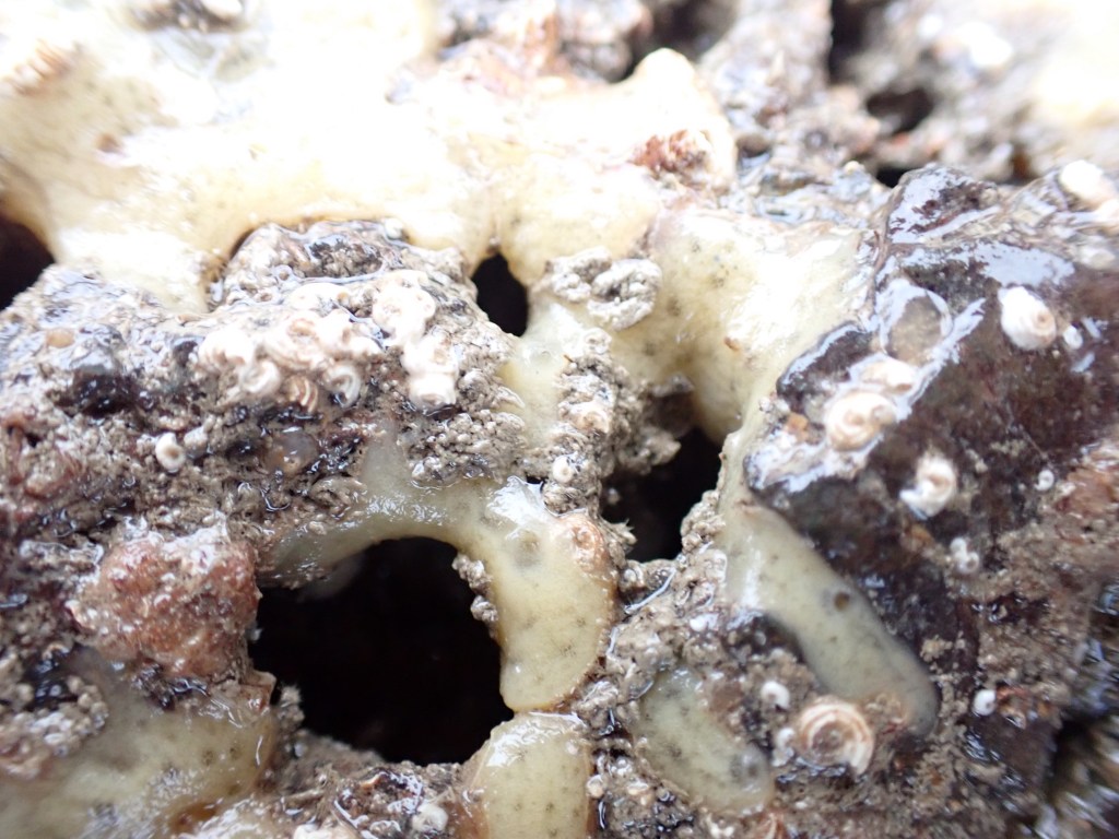 The dense seaweed made it hard to see into the water, but we found crabs, urchins and ascidians as we clambered ever further out across the rocks. We had a half-mile long stretch of beach all to ourselves and everything had fallen silent under the misty cloud.