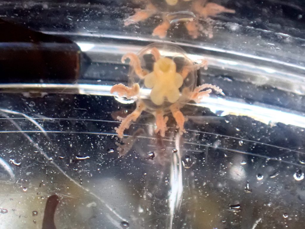 The whole animal was only a few millimetres long and for a moment I wondered if it was just a blob of seaweed. Junior and I peered into the bucket, heads touching. The blob had arms but wasn’t a stalked jelly. It looked more like a miniature space rocket pointed skyward, with trailing tentacles spread around its base. As we watched it launched, zipping across the bucket at surprising speed.