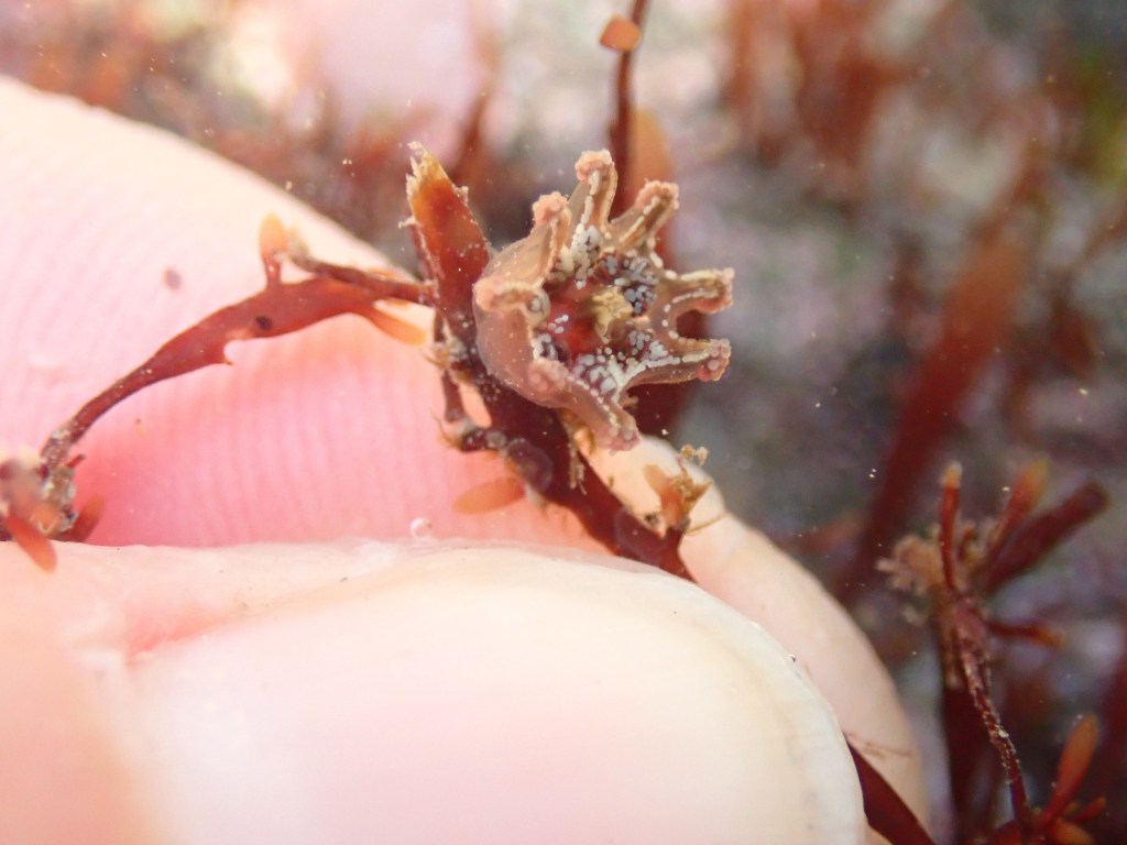 The Eubranchus exiguus slug on seaweed with my finger in the background to give an idea of scale. It was around 2mm long.