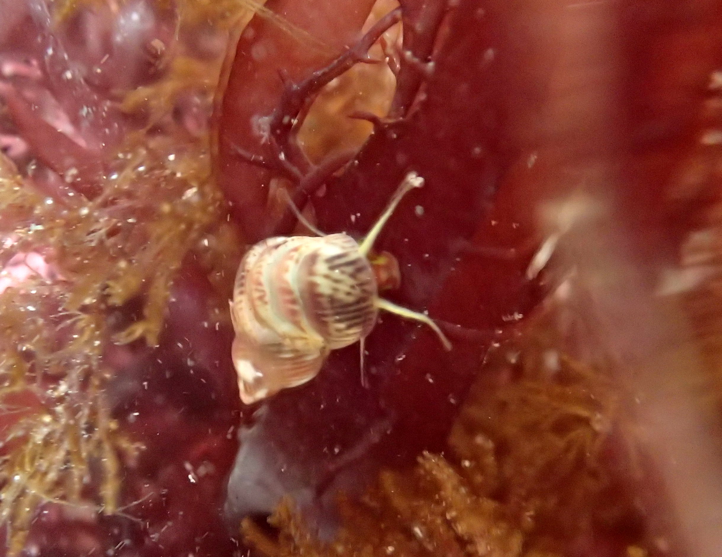Pheasant shells roam the canopy, young anemones cling on like epiphytes and the dense animal crust of sponges, sea squirts, hydroids and bryozoans around lower ‘branches’ attracts cowries and other small predators. Pretty Asterina phylactica cushion stars are everywhere and as I look down into the base of the seaweed, something else grabs my attention.